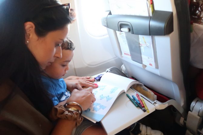 Durante a viagem acalmou e como eu me preveni com algumas coisas para o entreter até se portou bem (livros de atividades, lápis de cera, carrinhos e fiz download de alguns vídeos da Netflix , basicamente desenhos animados que ele gosta).